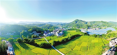 近日,兴国县东村乡澄江村的美丽秋色。田间晚稻由绿转黄,丰收在望,近有茂林修竹,远有青山连绵,还有错落的村居和大棚,构成一幅美丽的乡村秋色图。 记者刘凯 摄