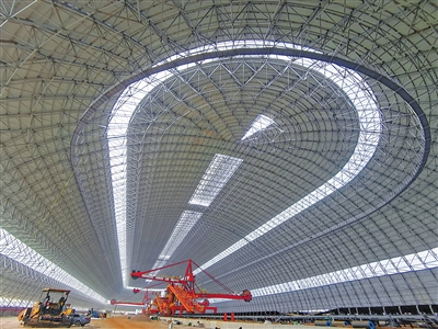 湖南岳阳全封闭“胶囊”形散货大棚完成封顶(4月9日摄)。湖南岳阳城陵矶港环保提质改造项目主体工程——全封闭“胶囊”形散货大棚长470米、宽110米、高46.5米,具有全封闭、装卸能力强、覆盖范围广等优点,将有效解决城陵矶港的货场粉尘污染问题,有利于保护长江生态环境。