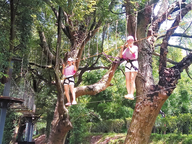 5月5日,赣县区江口镇小麻洲户外拓展基地,游客在进行“森林探险”运动。“五一”期间,江口镇每天做好小麻洲户外拓展基地、荷花塘农庄等乡村旅游景点场地消杀工作,游客凭预约、扫健康码、测体温后进入景区。水上运动、攀岩、荡秋千等户外拓展项目成为游客体验近郊乡村生态游喜爱的项目。