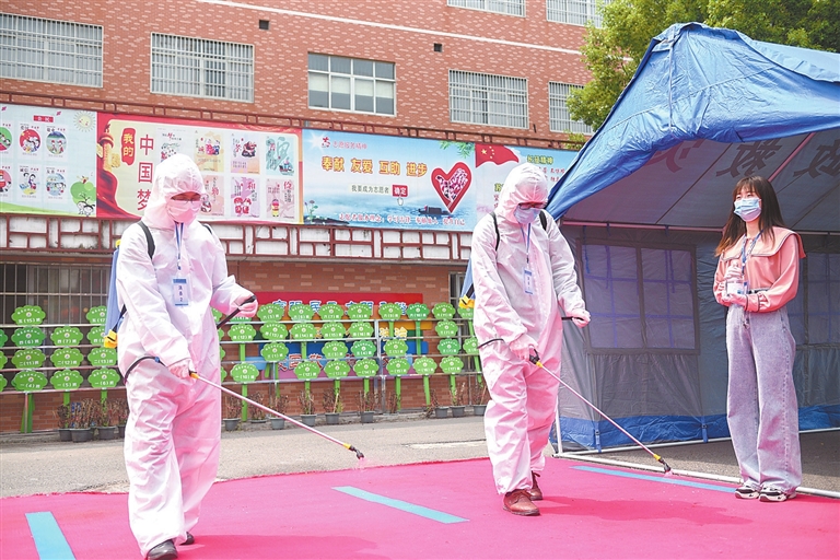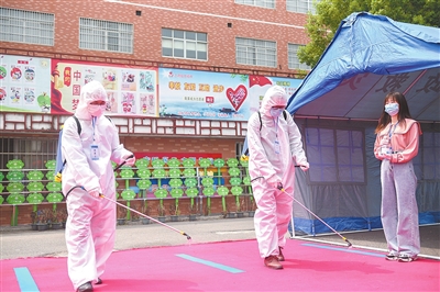 连日来,赣县区城关第四小学教师认真开展防疫应急演练和校园消杀工作,为迎接学生返校复学做好充分准备。演练过程紧张有序,每位老师根据演练“脚本”,做到分工明确、密切配合、精准掌握、专业高效,提升了疫情防控及应急处置能力。图为工作人员在认真细致消杀。