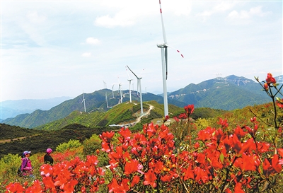 近日,石城县高田镇大唐国际金华山风电场,一台台风力发电机矗立在群山之巅,与火红的杜鹃相映成趣,构成一道靓丽风景线。