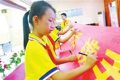 9月16日,赣州市西津路小学学生在“同讲普通话 携手奔小康”字样的横幅上签名。当天恰逢第二十三届全国推广普通话宣传周期间,该校作为我省首批语言文字规范化示范校,通过开展以“同讲普通话 携手奔小康”为主题的系列推普宣传教育活动,为学生提供一个自我展示和锻炼的平台,使学生的语言能力得以提升。