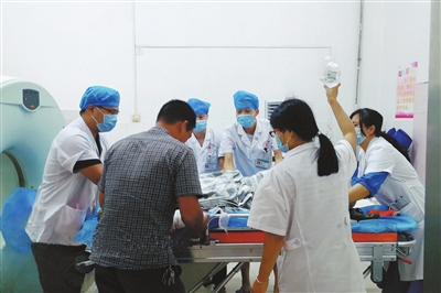 9月13日清晨,会昌县筠门岭镇竹村村水口坝上100米国道处突发车祸,40岁女性何某受伤严重。接到求救后,当地卫生院医师快速赶到现场,第一时间通过三级创伤网络群,向会昌县人民医院发出预警,并在该院医生的指导下对患者进行伤口包扎止血,测量生命体征,进行院前病情评估,开通双管补液抗休克,进行药物止痛等处置,完成后立即送往会昌县人民医院。会昌县人民医院根据伤情启动创伤急救中心响应预案,通知导诊台启动预警,通知相关外科到急诊外科MDT协诊。院前急救医师再次评估患者生命体征平稳,伤口无活动性出血,决定直接送到CT室检查。
