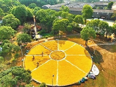 九月十七日,章贡区沙河镇,村民在广场晾晒稻谷,金黄的稻谷与村民忙碌的身影相映衬,一幅秋收图映入眼帘。连日来,赣州多地种植的晚稻进入收获期,各地村民抢抓农时进行收割晾晒,助力粮食增产增收。特约记者朱海鹏 摄
