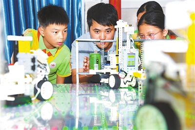 近日,于都县胜利学校的学生在老师的指导下学习机器人编程。暑假期间,于都县中小学根据学生、家长的意向,设置艺术类、体育类、科普类等特色课堂,为学生们提供形式多样的托管服务。