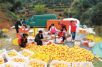 12月13日,在南康区赤土畲族乡小岭村,志愿者协助脐橙种植户采摘装箱。南康区利用新时代文明实践中心平台,开展“志愿+”服务活动,指导种植户做好防寒抗冻工作。特约记者杨晓明 通讯员李宛容 摄