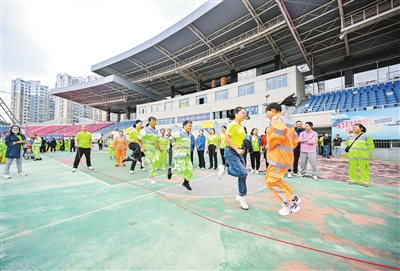 10月25日,在赣县区举办的环卫工人趣味运动会上,环卫工人正在参加跳绳比赛。在江西省第29个环卫工人节来临之际,赣县区通过举办多彩趣味比赛,让环卫工人在激情和快乐中放松身心,展示“城市美容师”风采,欢度环卫工人节。薛顺鑫 摄