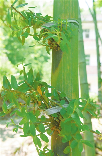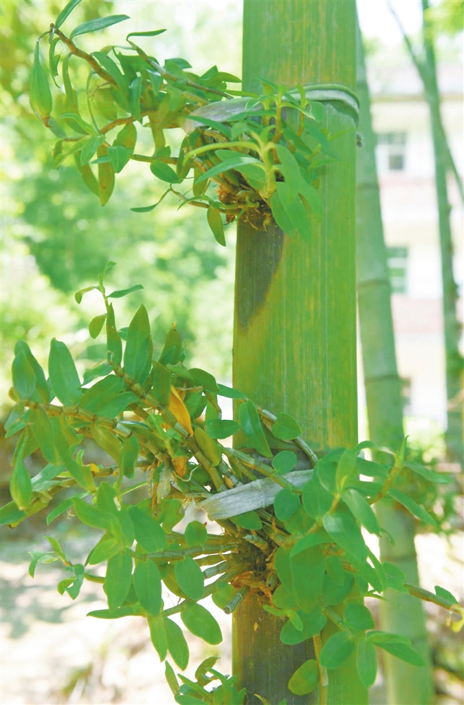 虽然仿野生栽植没有现成的参照,但袁志庚反复研读《林草中药材仿野生栽培通则》后,摒弃人工温室大棚栽植的思路,决定按照原生态的模式栽种。此前,他从《农民日报》一篇报道上了解到有人将铁皮石斛捆绑在树干、活竹节上栽植。细心的他很快发现:这种模式有一个缺陷,即需要经常喷水,费时费工很麻烦,于是,他联想到竹筒酒的生产工艺,顿时就来了灵感:何不参考竹筒酒的做法呢?豁然开朗的袁志庚很快找到一片竹林,在成年活竹腔开孔,填上碎石、木屑等基质料,利用竹腔溢出的竹液为养分,产生光合作用,最大限度提升铁皮石斛栽植的“野味”。“国家明确规定,野生石斛属植物,是国家二级重点保护珍稀濒危植物,禁止采集和销售,足见野生品类的珍贵、珍稀。”谈到铁皮石斛仿野生栽培方式的探索创新,袁志庚瞬间打开了话匣子,“因为铁皮石斛是气生根,这种以竹腔为载体的栽植模式不打药、不施肥,也不用浇水,最贴近野生石斛的品质效果……”