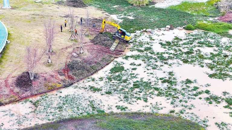 1月5日,在赣州蓉江新区新世纪公园十里花溪的人工湖,工人操作专业水葫芦打捞机械进行清理工作。通过“机械打捞为主、人工清理为辅”的方式,大幅提升清理效率和覆盖范围。此次行动累计清理水葫芦及漂浮物数千吨,有效恢复了水域原貌。