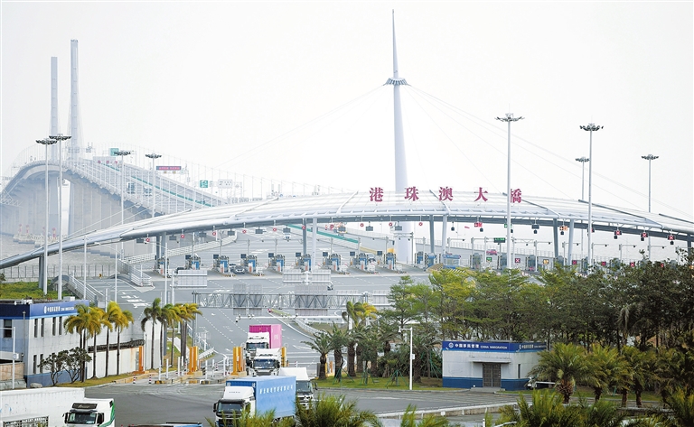 这是1月6日拍摄的港珠澳大桥出入口。自2018年10月开通到2026年1月6日,经港珠澳大桥珠海公路口岸往来粤港澳三地的旅客突破1亿人次。港珠澳大桥全长55公里,是世界最长的跨海大桥。2018年10月,大桥正式建成通车,香港到珠海、澳门的车程从3个小时缩短至约45分钟,大大缩短三地时空距离。随着“澳车北上”“港车北上”“粤车南下”等政策相继实施,大桥见证了粤港澳大湾区融合的加速度。